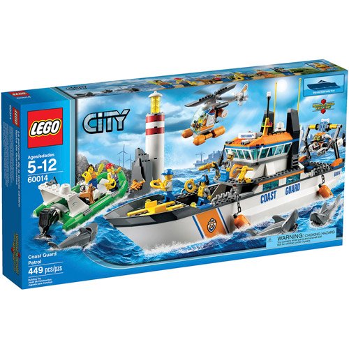 Head out to the lighthouse quick with the LEGO City Coast Guard Patrol! There's a couple stranded in a sinking dinghy and three sharks are swimming nearby! Launch the submarine and helicopter from the Coast Guard Patrol boat to get there fast. Rescue the couple with the life preservers, pull them into the helicopter and scare the sharks away with the water cannons! Includes three sharks and six minifigures with accessories: pilot, captain, crewmember, rescuer, man and woman.LEGO City Coast Guard Patrol Play Set:Coast Guard Patrol boat and dinghy really floatDeploy the submarine with a turning propellerMake the rescue before the sharks move inSpin the helicopter rotorsFeatures 2 water cannons, submarine launcher and radio antenna, helicopter, submarine, dinghy, lighthouse with rocks and 3 sharksIncludes 6 minifigures with accessories: pilot, captain, crew member, rescuer and stricken man and womanAccessories include a dog, crab, 2 life preservers, 2 life jackets, walkie-talkie, hat with headphones and an ice creamCoast Guard Patrol Boat measures: 15"L (40cm) x 3"W (9cm) x over 7"H (20cm)Helicopter measures: 6"L (16cm) x 2"W (6cm) x over 2"H (7cm)Submarine measures: 3"L (8cm) x 2"W (7cm) x over 1"H (3cm)Dinghy measures: 7"L (20cm) x 3"W (8cm) x over 2"H (6cm)Lighthouse with rocks measures: 2"L (6cm) x 5"W (13cm) x over 6"H (16cm)Shark measures: over 2"L (7cm) x 1"W (3cm) x less than 1"H (2cm)Number of pieces: 449Model# 60014