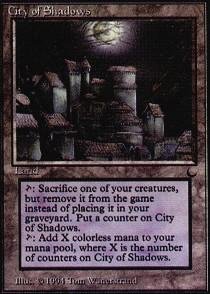 Card Text: T, Remove a creature you control from the game Put a storage counter on City of Shadows. T Add X to your mana pool, where X is the number of storage counters on City of Shadows.